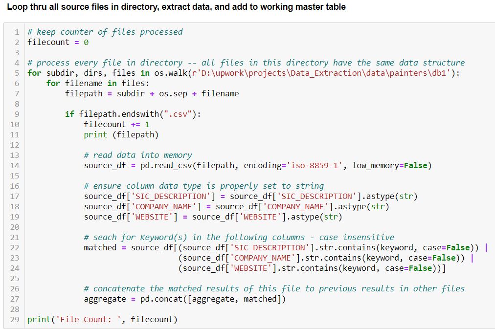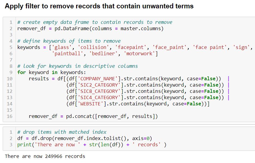 3. Define Top Level Filter and extract records – The following code looked for the term ‘paint’ in the columns ‘COMPANY_NAME’, ‘SIC_DESCRIPTION’, and ‘WEBSITE’. Records with a match were extracted and compiled.