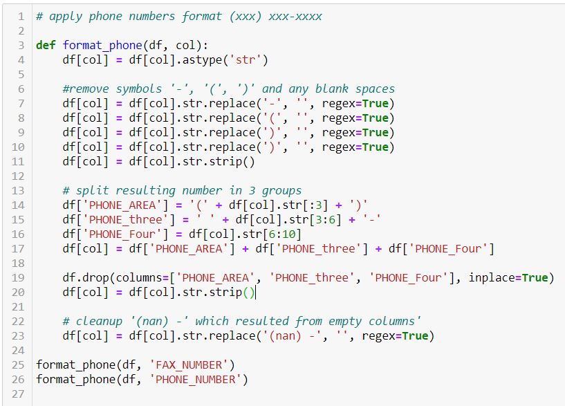 6. Format and Standardize entries – The phone and fax numbers contained mixed formats. Some numbers were entered without any format such as 14072332211, other formatted as (###) – ###- ####. The code applied first strips the entries to numbers only and then applies the (###) – ### – #### format.
