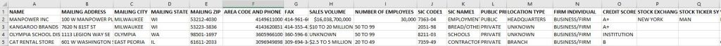 Explore data structure – First we explore the structure of each data set. Below we can see that many of the column titles do not match. For example, for Company Name we have ‘COMPANY_NAME’, ‘NAME’, ‘Company’ and ‘Business Name’. Also as expected not all datasets contain the same type of information.